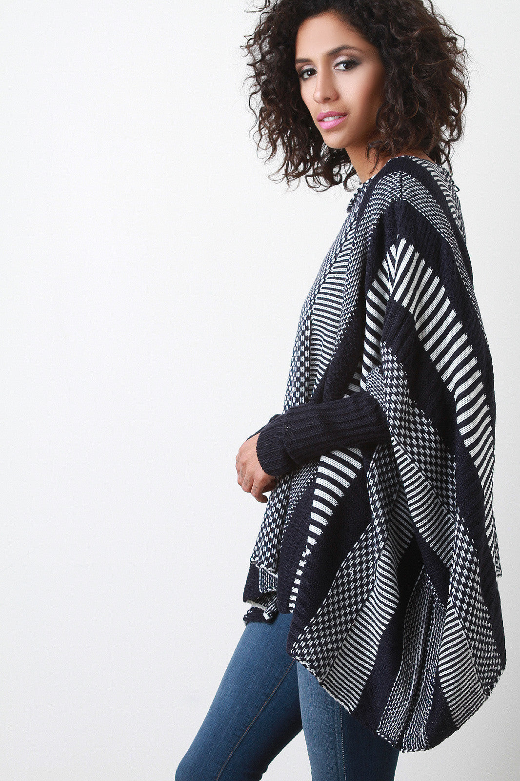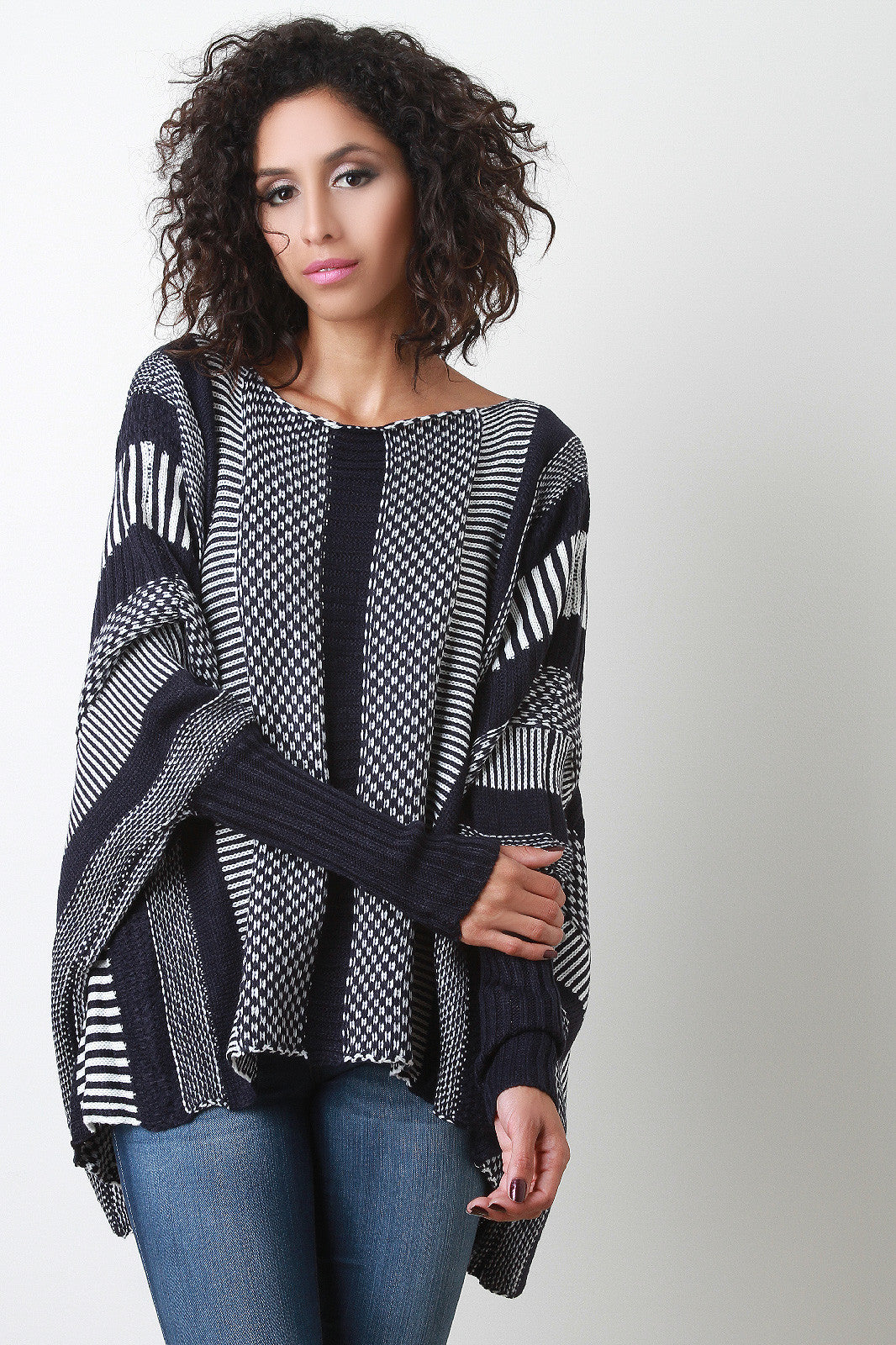 An oversize round neck sweater featuring stripes of different patterned knits, dropped shoulders, and dolman sleeves with long ribbed cuffs. Accessories sold separately. 100% Acrylic.