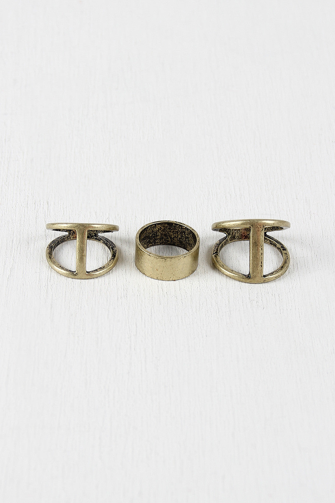 This antique-finish ring set features two rings with a vertical bar design and a wide metallic midi ring. Bands are non-adjustable.